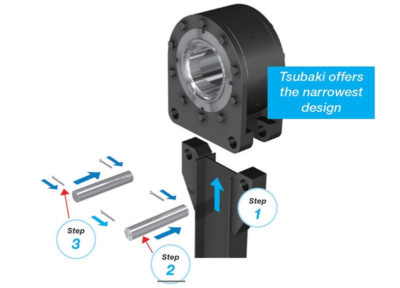 • Tsubaki offers the narrowest backstop with an I-beam torque arm.